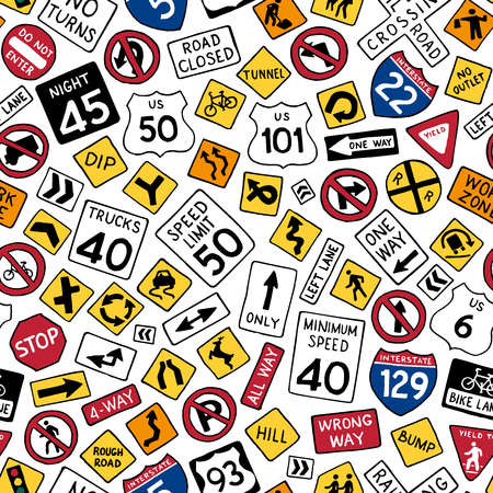 漫画アメリカ道路標識のシームレスなパターン 背景のベクトル手描きトラフィックに署名します 無限のテクスチャは Web ページの背景 壁紙 包装紙 招待状 お祝いの言葉 子供のデザインに使用できます のイラスト素材 ベクタ Image